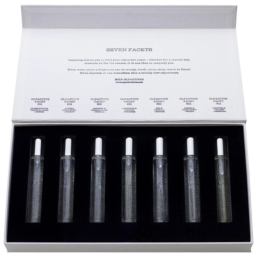 Seven Facets is ontworpen om de collectie van N.C.P. de ultieme gelaagdheid te bieden. Dit is een unieke collectiebox die zeven verschillende parfums van de Olfactive-familie bevat. De parfums kunnen afzonderlijk of gecombineerd met elkaar worden gedragen. Zo creëer je jouw eigen karakteristieke geur.